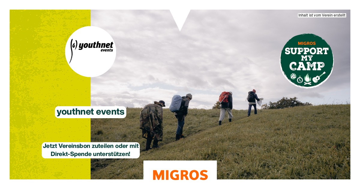 Unterstütze uns jetzt auf ganz einfache Weise mit deinem Vereinsbon, welchen du bei einem Betrag in der Migros für CHF 20 erhältst. Weise diesen unter https://supportmycamp.migros.ch/de/vereine/youthnet-events/ an uns zu oder unterstütze uns mit einem freien Betrag unter https://donate.raisenow.io/cxqrt
